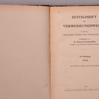 14 Hefte der "Zeitschrift für Vermessungswesen" aus den Jahren 1950-1969. Heft 3, 75. Jahrgang 1950; Heft 3, 76. Jahrgang 1951; Heft 4, 76. Jahrgang 1951; Heft 1, 88. Jahrgang 1963; Heft 2, 88. Jahrgang 1963; Heft 3, 88. Jahrgang 1963; Heft 4, 88. Jahrgang 1963; Heft 6, 88. Jahrgang 1963; Heft 7, 88. Jahrgang 1963; Heft 8, 88. Jahrgang 1963; Heft 9, 88. Jahrgang 1963; Heft 4, 93. Jahrgang 1968; Heft 5, 94. Jahrgang 1969; Heft 9, 94. Jahrgang 1969.